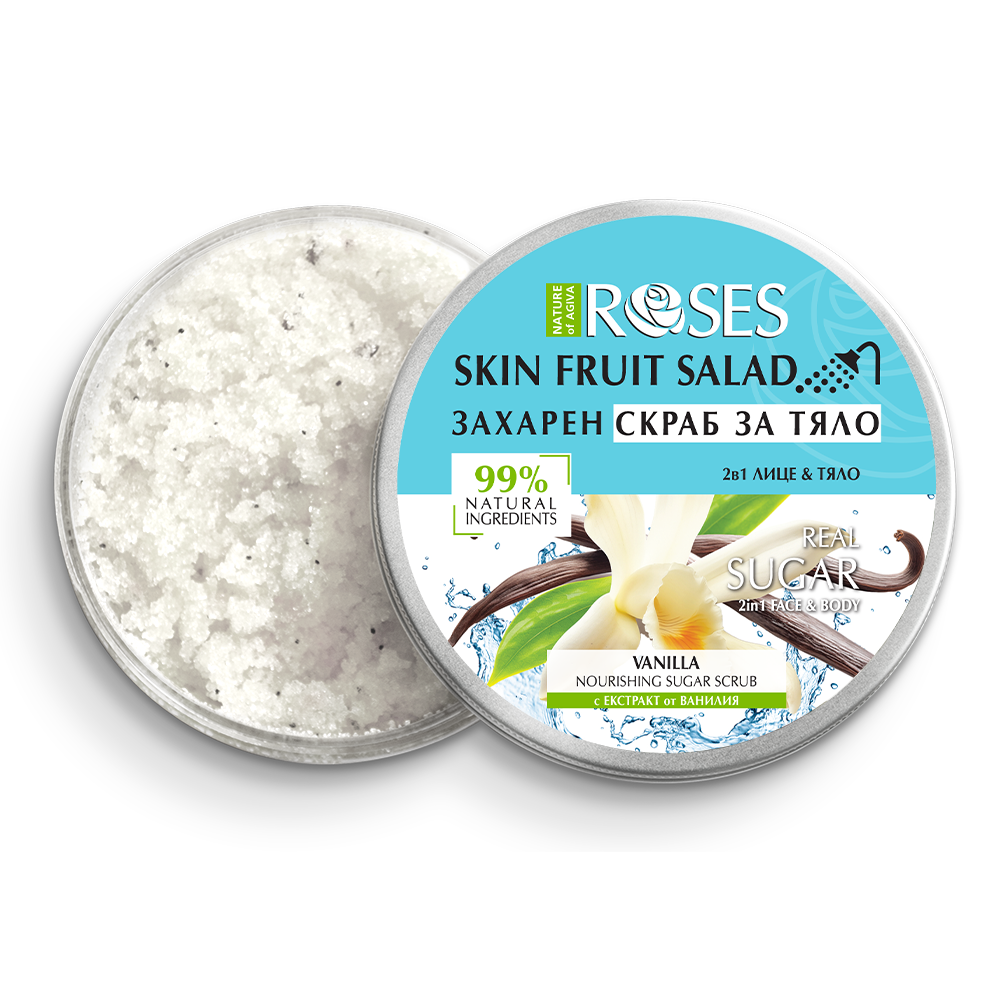 NATURE OF AGIVA FRUIT SALAD Cukrový peeling je jemný, no účinný peeling určený na starostlivosť o pokožku tváre aj tela. Obsahuje pravý cukor a 100 % prírodné exfoliačné častice, ktoré šetrne odstraňujú odumreté kožné bunky a podporujú obnovu pokožky.