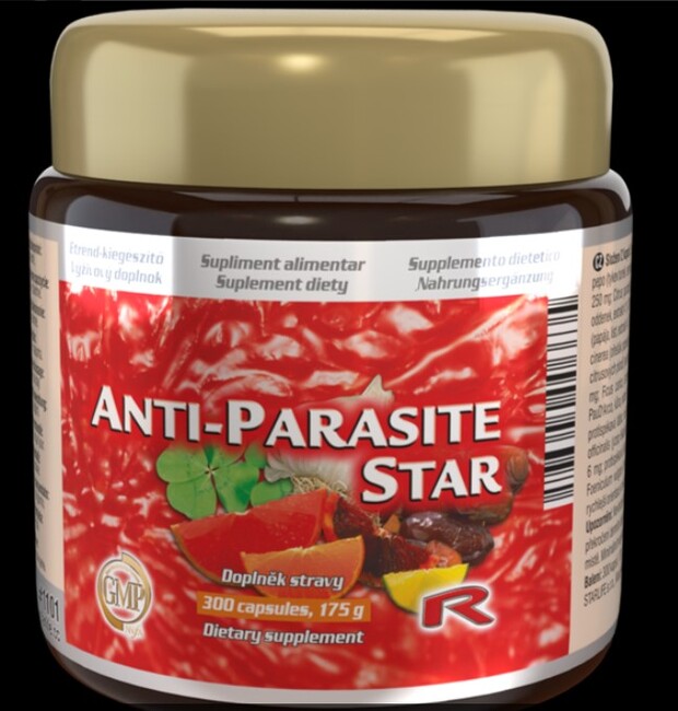 ANTI-PARASITE STAR XXL, 300 kapsúlStarlife produkty – proti parazitomParazity sa nevyskytujú len u psov a mačiek, ale aj v ľudskom tele. Najčastejšie ide o mrle, pásomnice či hlísty, ktoré žijú v tráviacom ústrojenstve. Časté sú hlísty u detí, no v súčasnosti sa nachádza aj mnoho hlíst u dospelých. Parazity v tele sa môžu prejaviť rôzne: svrbením v konečníku, kŕčmi v bruchu, svrbením tela. Anti – parasite je antiparazitikum pre ľudí, ktorý svojim rastlinným zložením bojuje proti parazitom v tele. Predstavuje úspešnú náhradu za rôzne tabletky na odčervenie.Anti-parasite Star – prírodné antiparazitikum Synergia množstva darov prírody je ukrytá v kapsuliach Anti-parasite Star: 1. Bedrovník anízový2. Citrusové plody3. Cesnak kuchynský4. Fenikel obyčajný5. Grapefruit6. Horec žltý7. Klinčekovec voňavý8. Ďatelina lúčna9. Kľukva veľkoplodá10. Lapacho – Pau D´Arco11. Marhaník obyčajný12. Mäta pieporná13. Olivovník európsky14. Orech popolavý15. Papája16. Figovník obyčajný17. Tekvica obyčajná18. Yzop lekárksky19. Zázvor lekársky Účinné látky Anti-parasite: Tekvica(Cucurbita pepo) sa pestovala sa už v roku 4500 pred naším letopočtom. Jej účinky poznali a využívali Indiáni. Jedli však nielen plody, ale aj listy a semienka. Vedeli totiž, že práve v nich sa ukrýva tajomstvo kvalitného sexu a štíhlosti. Tieto časti tekvice pôsobia totiž ako afrodiziakum a majú tiež diuretické účinky. Tekvicové semienka obsahujú cucurbitacíny, ktoré zabraňujú premene hormónu testosterón na jeho aktívnejšiu formu dihydrotestosterón. Ten stimuluje bunky prostaty k ďalšiemu rastu a zapríčiňuje ich nežiaduce zväčšenie. Semená tekvice sú jedným z najbohatších zdrojov aminokyseliny tryptofán. Keďže ju poškodzuje tepelné spracovanie potravín, väčšina ľudí trpí jej nedostatkom. Pritom práve ona ovplyvňuje vyplavovanie serotonínu v mozgu, čím môže priaznivo ovplyvniť náladu a eliminovať sklony k depresii. Tekvicové jadierka sú bohatým zdrojom nenasýtených mastných kyselín.Cesnak známy aj ako medvedí cesnak má nenahraditeľné účinky. Je považovaný za prírodné antibiotikum. Obsahuje dve základné zlúčeniny, a to aminokyselinu alicín a enzým na báze bielkoviny alinázu. Má silné antibakteriálne a antivírusové účinky. Okrem základných zlúčenín obsahuje aj desať rôznych prírodných cukrov, vrátane fruktózy, glukózy a inzulínu, tiež veľké množstvo minerálov, ako je meď, železo, zinok, vápnik, mangán, hliník či selén.tiež podporuje činnosť bielych krviniek bojovať s infekciami a stimuluje imunitné bunky v boji proti vírusovej alebo bakteriálnej infekcii. Cesnak ako liek svojim účinkom napomáha pri:parazitoch – zvýšené dávky cesnaku sú schopné zabiť parazity v tele, prípadne ich z organizmu vyhnaťischemickej chorobe srdca – rozpúšťa povlak, ktorý sa vytvára na cievach a bráni jeho vzniku.vysokom cholesteroletehotenstve – užívanie cesnaku v tehotenstve môže znížiť riziko preeklampsie a dokáže podporiť a stimulovať zdravý vývoj dieťaťa, znižuje aj riziko komplikácií pri pôrode či riziko nízkej pôrodnej hmotnosti dieťaťabakteriálnych infekciách – zabíja baktérie a chráni telo pred jedmi. vírusových infekciách – lieči kašeľ a podráždené hrdlo, uvoľňuje od bolesti a podráždeniaimpotencii – prekrvuje pohlavné orgány a ovplyvňuje mužskú potenciužalúdočných vredoch – stimuluje sliznicu žalúdka, podporuje sekréciu žalúdočných štiav, znižuje nadmernú aktivitu žalúdka, reguluje funkciu hrubého čreva, napomáha dobrému tráveniu, chráni pred zápchami a hnačkamiKlinčekpriaznivo pôsobí proti parazitom a ich vajíčkam. Stimuluje žalúdok a pľúca a zároveň dezinfikuje lymfatickú sústavu a odstraňuje chlad. Jeho hlavnou zložkou je klinčeková silica s fenolickou zlúčeninou eugenol, ktorá sa využíva vo farmaceutickom priemysle. Okrem toho klinček podporuje trávenie a podporuje chuť do jedla. Prispieva k správnej funkcii srdca a ciev a k stimulácii krvného obehu. Udržiava zdravé dýchacie cesty a pôsobí ako antioxidant.Zázvor ako liekuznávali už v staroveku. Už po stáročia je známy pre svoje antibiotické látky, gingerol, éterické oleje, vitamíny a minerály. Zázvor napomáha pri chrípke, nádche a angíne, pôsobí ako afrodiziakum, zlepšuje prietok krvi a znižuje riziko srdcovo-cievnych ochorení – je vhodný pri nadmernom zrážaní krvi a vytváraniu krvných zrazenín. Uvoľňuje cievy a prehrieva končatiny, podporuje imunitu, zlepšuje trávenie – pomáha pri hnačkách, kedy odstraňuje vírusy z črevného traktu, detoxikuje telo – zvyšuje činnosť pečene, ktorá pomáha prečistiť telo od toxínov, zlepšuje dýchanie a vykašliavanie počas chrípky – uvoľňuje hlieny z dýchacích ciest, eliminuje rast rakovinových buniek – spomaľuje a zastavuje rast rakovinových buniek.Anízje používaný pre uvoľnenie od kŕčov a ako podpora tvorby materského mlieka. Privoláva pokojný spánok. V stredoveku sa používal ako prísada do koláčov a chlebov.Papaya melónováa jej enzým papaín ničia črevné parazity.Yzop lekárskypodporuje trávenie a znižuje potenie. Je známy už z obdobia praveku, od kedy je známy, že lieči dýchanie a hubí červy v žalúdku.Mäta priepornápodporuje trávenie, no zároveň čistí krv, znižuje bolesti hlavy, znižuje nevoľnosť aj pocit únavy. Používa sa na zmiernenie žalúdočných, žlčových a črevných ťažkostí.Fenikel zlepšujechuť do jedla a podporuje liečbu gynekologických problémov. Dávkovanie: 1 kapsula 2x denne po dobu 25 dní a potom na 5 dní prerušiť a opäť pokračovaťObsah balenia: 300 kapsúlCena: závisí od spôsobu pestovania spracovania jednotlivých rastlinných zložiekZloženie 1