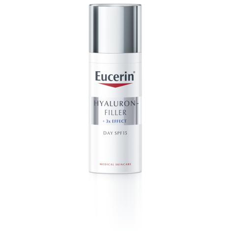 Charakteristika: Eucerin Hyaluron-Filler + 3x EFFECT Denný krém na normálnu a zmiešanú pleť SPF 15 bojuje s prvými známkami starnutia zmiešanej pleti. Viditeľne vyhladzuje jemné linky aj hlboké vrásky, a stará sa tak o mladistvý vzhľad pleti. Poskytuje pleti účinnú ochranu proti predčasnému starnutiu spôsobenému UV žiarením a proti prehlbovaniu vrások a zároveň ju chráni pred voľnými radikálmi.