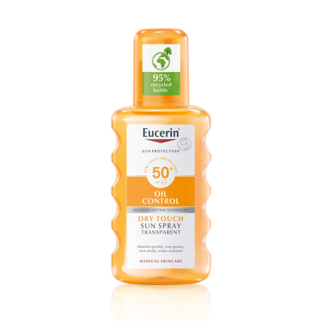 Eucerin SUN DRY TOUCH OIL CONTROL Transparentný sprej SPF 50+ je sprej na opaľovanie pre pokožku tela, ktorý upokojuje a chráni citlivú pokožku, vrátane aknóznej pokožky. Technológia Advanced Spectral Technology kombinuje širokospektrálne a fotostabilné UVA/UVB filtre (1) pre vysokú UV ochranu s licochalconom A, ktorý neutralizuje voľné radikály vyvolané pôsobením UV žiarenia a vysokoenergetického viditeľného svetla.