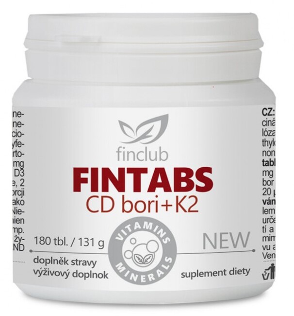 Fintabs CD bori – pre pevné kosti vo vyššom veku+ vitamin K2 Fintabs CD bori – pomáha predovšetkým populácii stredného veku, ženám v prechode a staršej generácii, kedy je minerály potrebné nielen dodávať, ale taktiež znižovať vyplavovanie vápnika z kostí. Je vhodný pre pacientov so zlomeninami a pre všetkých, u ktorých sa objavujú známky osteoporózy. Obsiahnutý bór a vitamín K1 výrazne znižujú vylučovanie vápnika z kostí, čo je veľmi dôležité, lebo vo vyššom veku je vstrebávanie vápnika problematické. V súčasnej dobe je vážnym zdravotným problémom osteoporóza. Na Slovensku je touto chorobou postihnuté veľké množstvo obyvateľov. Osteoporóza (rednutie či odvápnenie kostí) býva nazývaná aj tichým zlodejom kostí, pretože dlho nebolí ani neprekáža. Je ale nebezpečná, pretože pri tomto postihnutí kostí dochádza k úbytku kostnej hmoty, znižuje sa pevnosť kostí a tým sa zvyšuje riziko zlomenín. Štatistika hovorí, že takmer 90 % zlomenín krčku stehennej kosti vzniká v súvislosti s osteoporózou a že v EU každých 30 sekúnd dochádza k zlomenine následkom tejto choroby. Preto je dôležité nečakať, kým osteoporóza príde, ale brániť sa v priebehu celého života, aby sme aj vo vyššom veku mohli byť sebestační, aktívni a nebáli sa zlomenín.Kedy Fintabs CD bori pomáha:výborný pre strednú a staršiu generáciu, pre ženy v prechode (vďaka bóru a vitamínu K1 znižuje uvoľňovanie vápnika z kostí)vhodný pri zlomenináchúčinná ochrana proti osteoporózezaručuje kvalitný stav nechtov a pokožkyvďaka obsahu vitamínu K1 zlepšuje funkciu buniek, ktoré sa podieľajú na tvorbe a regenerácii kostíZloženie: v 1 tablete: 1 tablety: uhličitan vápenatý, uhličitan horečnatý, čistený diatomit SiO2, látky protihrudkujúce mikrokryštalická celulóza, stearan horečnatý; L-askorbová kys., Boritan sodný, cholekalciferol, menachynon, D-biotín. Obsah v 4 tabletách (% dennej referenčnej hodnoty príjmu): čistený diatomit SiO2 420 mg (tj. 196 mg kremíka), horčík 240 mg (64%), vit. C 75 mg (94%),vápnik 400 mg (50%), bór 3,2 mg, vit. K1 70 µg (93%), vit. D3 10 µg (200%),biotín 30 , (60%), vit. k2 45µg 60%.Dávkovanie: dospelí 4 tablety denne,ráno a napoludnie pred alebo po jedle. Nie je vhodný pre deti do 3 rokov. Výrobok neobsahuje glutén.Balenie: 180 tabliet/131gUpozornenie podľa nariadenia komisie EÚ: Tento produkt je registrovaný ako doplnok stravy. Nemá schválené liečivé účinky a nejedná sa o liek. Nie je určené ako náhrada pestrej stravy. Neprekračujte odporúčané dávkovanie. Ukladajte mimo dosahu detí. Minimálna trvanlivosť vyznačená na obale.