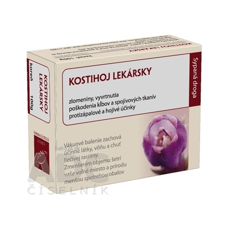 Sypaná droga Kostihoj lekársky – koreň (lat. Symphytum officinale), vákuovo balená. Vákuové balenie zachová účinné látky, vôňu a chuť liečivej rastliny.
