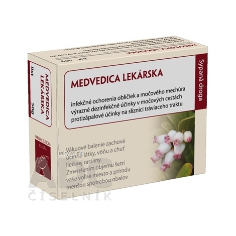 Sypaná droga Medvedica lekárska – list (lat. Arctostaphylos uva-ursi), vákuovo balená. Vákuové balenie zachová účinné látky, vôňu a chuť liečivej rastliny.