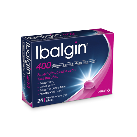Indikácie: Liek Ibalgin 400 sa užíva pri miernej až strednej bolesti, napr. pri bolesti hlavy, zubov, chrbta, pri bolestivej menštruácii, pri bolesti svalov a kĺbov sprevádzajúcich chrípkové ochorenia, pri poraneniach mäkkých tkanív ako je pomliaždenie a vyvrtnutie, ďalej pri horúčkovitých stavoch počas chrípkových ochorení a ako doplnková liečba horúčkovitých stavov pri iných ochoreniach. Liek Ibalgin 400 obsahuje liečivo ibuprofén, ktorá patrí do skupiny tzv. nesteroidných protizápalových liečiv. Zabraňuje tvorbe prostaglandínov, ktoré sú zodpovedné za vznik bolesti a zápalu a uvoľňujú sa v mieste poškodenia tkaniva.