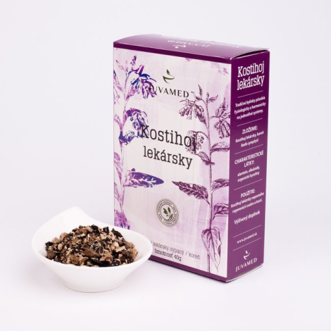 Charakteristika: Bylinný čaj Juvamed Kostihoj lekársky – Koreň má hojivé a protizápalové účinky. Používa sa zvonka pri zápaloch sliznice dutiny ústnej, kože, ťažko sa hojacich ranách. Napomáha aj hojeniu zlomených kostí. Droga má aj expektoračné a diuretické účinky.