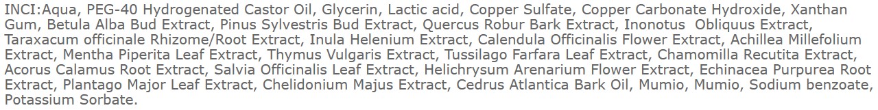 Tajomstvo Malahitu spočíva v jeho jedinečnom zložení. Zahŕňa výťažky z púčikov brezy, borovice, extrakt z huby čaga a rôznych liečivých rastlín ako skorocel, harmanček, nechtík, mäta a iné. Malahit je obohatený ešte aj o ďalšiu cennú zložku – mumio. Je to prírodná látka s mnohými blahodárnymi účinkami na organizmus. Mumio je známe svojimi antiseptickými vlastnosťami, pomáha bojovať proti baktériám a zápalovým procesom. Podporuje aktívny proces regenerácie, pomáha pokožke rýchlejšie sa hojiť a regenerovať.