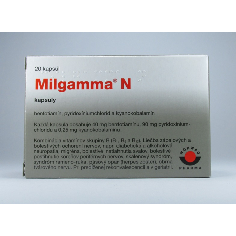 Indikácie: Milgamma N je liek na liečbu neuropatie. Milgamma N sa používa na liečbu zápalových a bolestivých ochorení nervov ako je diabetická a alkoholická polyneuropatia, migréna, bolestivé postihnutie koreňov periférnych nervov, skalenový syndróm, syndróm rameno-ruka, pásový opar (herpes zoster), obrna (paréza) tvárového nervu. Používa sa tiež pri predĺženej rekonvalescencii (zotavení sa) a v geriatrii.
