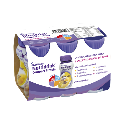 Charakteristika: Dietetická potravina Nutridrink Compact Protein je vysoko energetická, nutrične nekompletná tekutá výživa s vysokým obsahom bielkovín. Nutridrink Comapct Protein je tekutá výživa špeciálne vyvinutá pre pacientov so zvýšenou potrebou energie a nedostatočným príjmom živín. Môže slúžiť ako čiastočná alebo úplná náhrada stravy pre pacientov trpiacich podvýživou súvisiacou s ochorením alebo jej riziku. Bez gluténu. Ošetrené UHT, balené v ochrannej atmosfére.