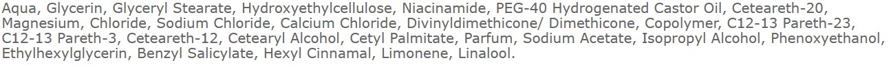 - Niacinamide : Zlepšuje elasticitu pokožky, znižuje začervenanie a má protizápalové účinky
