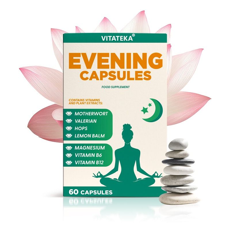 Večerný relax komplex – Vitateka je doplnok stravy vo forme kapsúl určený na užívanie vo večerných hodinách. Obsahuje kombináciu horčíka, vitamínov skupiny B, aminokyselín a rastlinných extraktov, ktoré podporujú relaxáciu a psychickú pohodu.