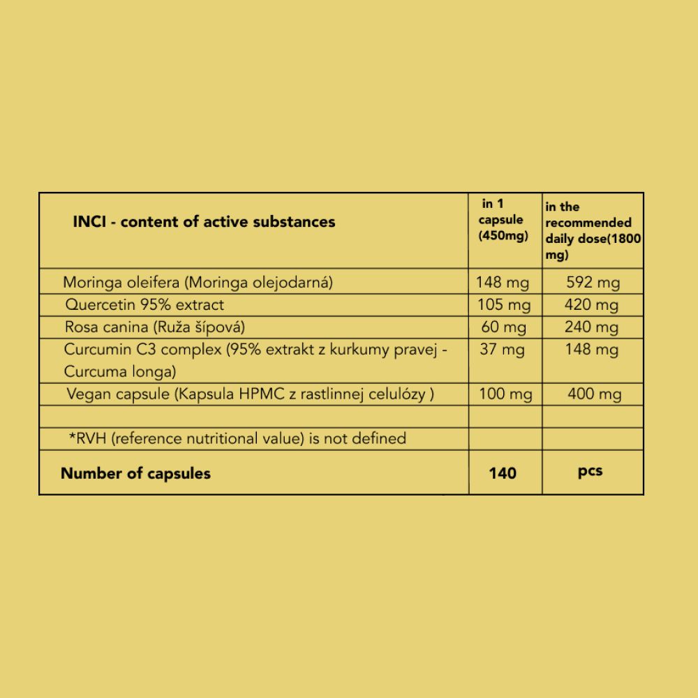Moringa obsahuje 3 najsilnejšie antihistaminiká – polyfenoly, flavonoidy a antioxidanty v kombinácii s vyššou hladinou Omega – 3 mastných kyselín. Dodáva organizmu množstvo vysoko účinných látok pôsobiacich proti uvoľneniu histamínu, proti zápalom a pôsobí regeneračné a hojivo na prebiehajúce ochorenia. Moringa je zároveň zdrojom rastlinných proteínov, dôležitých vitamínov ( napr. vitamínov A, E, K, B1, B2, B3, B6, B12 ), minerálov ako draslík, vápnik, fosfor, horčík, železo, zinok, mangán, meď, selén, síra a pod. - Quercetin 95% extrakt:
